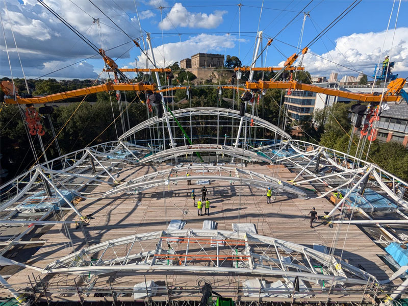Hoist & Winch Ltd provided a comprehensive lifting solution for the complex replacement of the tensile roof covering on a landmark building at Nottingham University's Castle Meadow Campus, a former HMRC complex resembling London's O2 Arena. Tasked by the specialist subcontractor, Hoist & Winch supplied 12 x CM Lodestar electric chain hoists, bespoke control stations, and a number of large capacity William Hackett lever hoists to safely lower the old roof and raise the new one. Their technical consultancy covered crucial aspects like legislation, planning, and equipment selection, ensuring a smooth and successful operation. The subcontractor was highly satisfied, leading to further collaborations and leveraging the acquired knowledge for a similar project in Copenhagen.